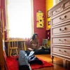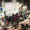 Alahna watching her production at the Nobel Museum Exhibit, A Right to Freedom.